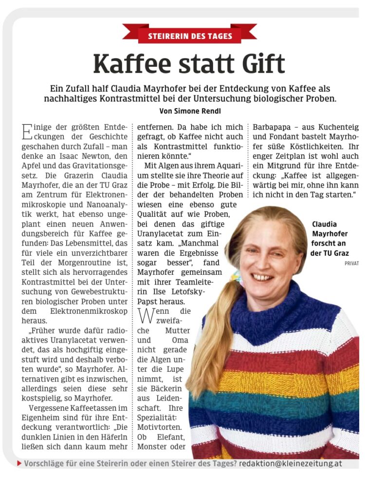 Claudia ist die stolze Mama von Sara Mayrhofer und erprobt heuer zum ersten Mal, woher das riesengroße Talent ihrer Tochter wohl stammen könnte. Auf jeden Fall bleibt sie ihrer Leidenschaft für Torten & Co (Wildoner Schlossbergkekse!) treu, es wird wieder einiges aus ihrer Küche geben! Ihre Leidenschaft für Kaffee war ihr auch für ihre berufliche Tätigkeit wichtig, wie die "Steirerin des Tages" vom 12.1. zeigt.