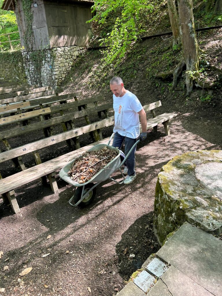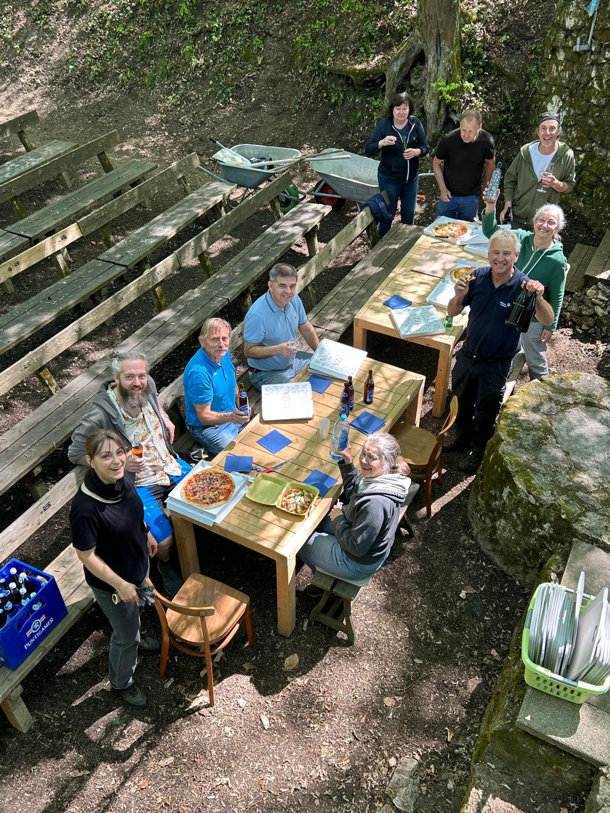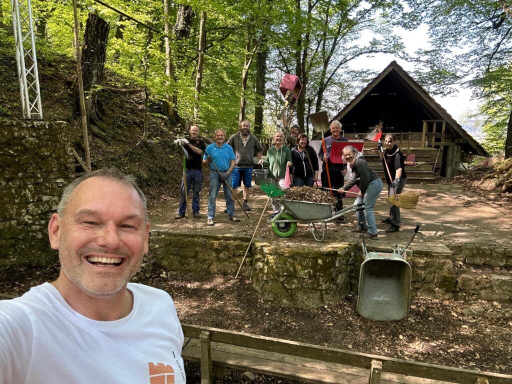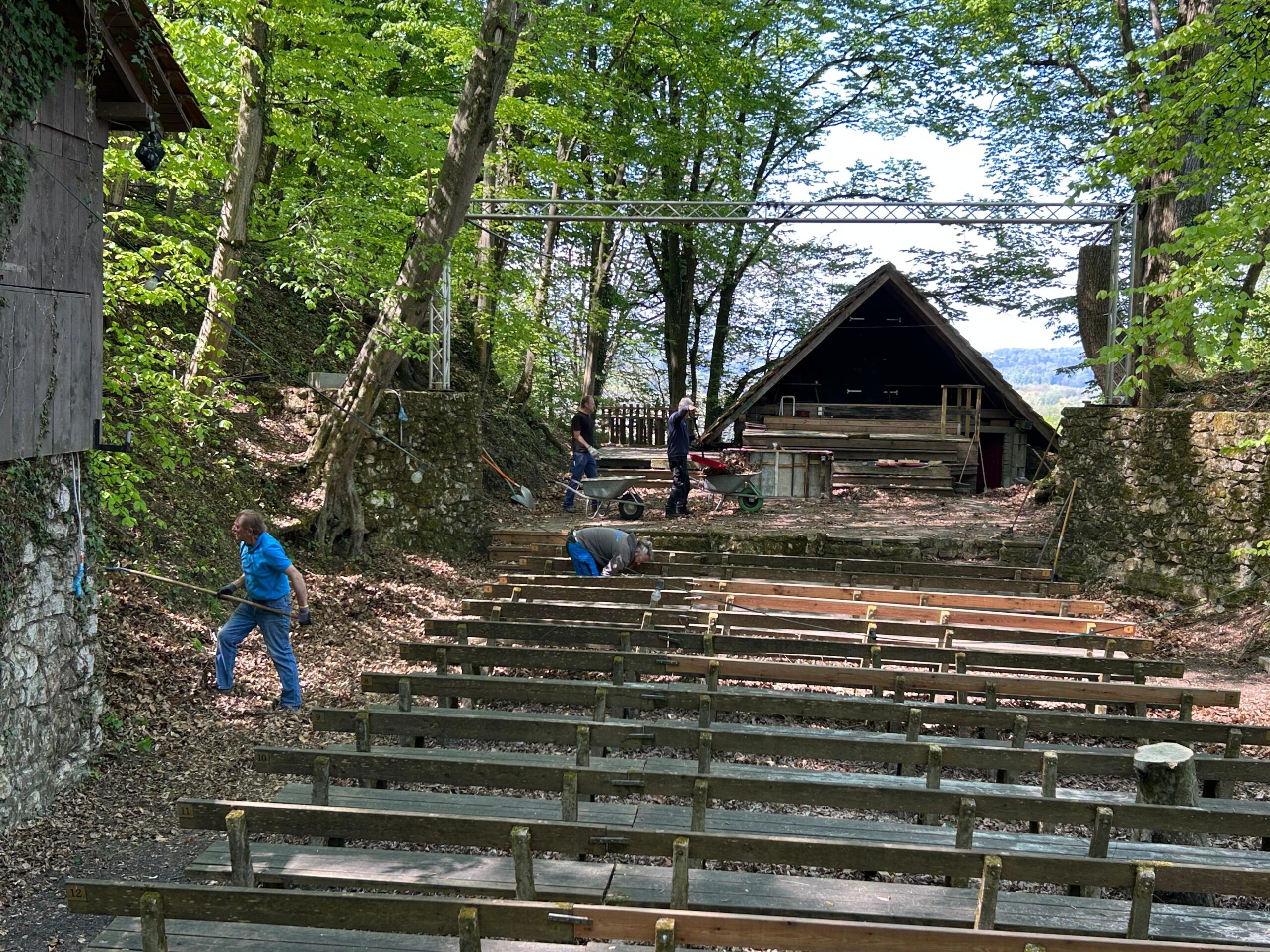 Man kann es kaum glauben, wie reich uns die Natur über den letzten Winter beschenkt hat. Flächendeckend verschwanden Zuschauerraum und Bühne unter Laub und Ästen. Das mag romantisch aussehen, aber: So kann dort kein Theater gemacht werden! Also machte sich eine beherzte Gruppe auf, um dem ganzen Material zu Leibe zu rücken. Es wäre beinahe ein antikes Heldenepos wert, wie da unter höchstem Einsatz Gelände und Anlage gesäubert wurden. Zur Belohnung gab es feine Pizzen vom Marktstüberl Draxler, persönlich überreicht vom Chef!