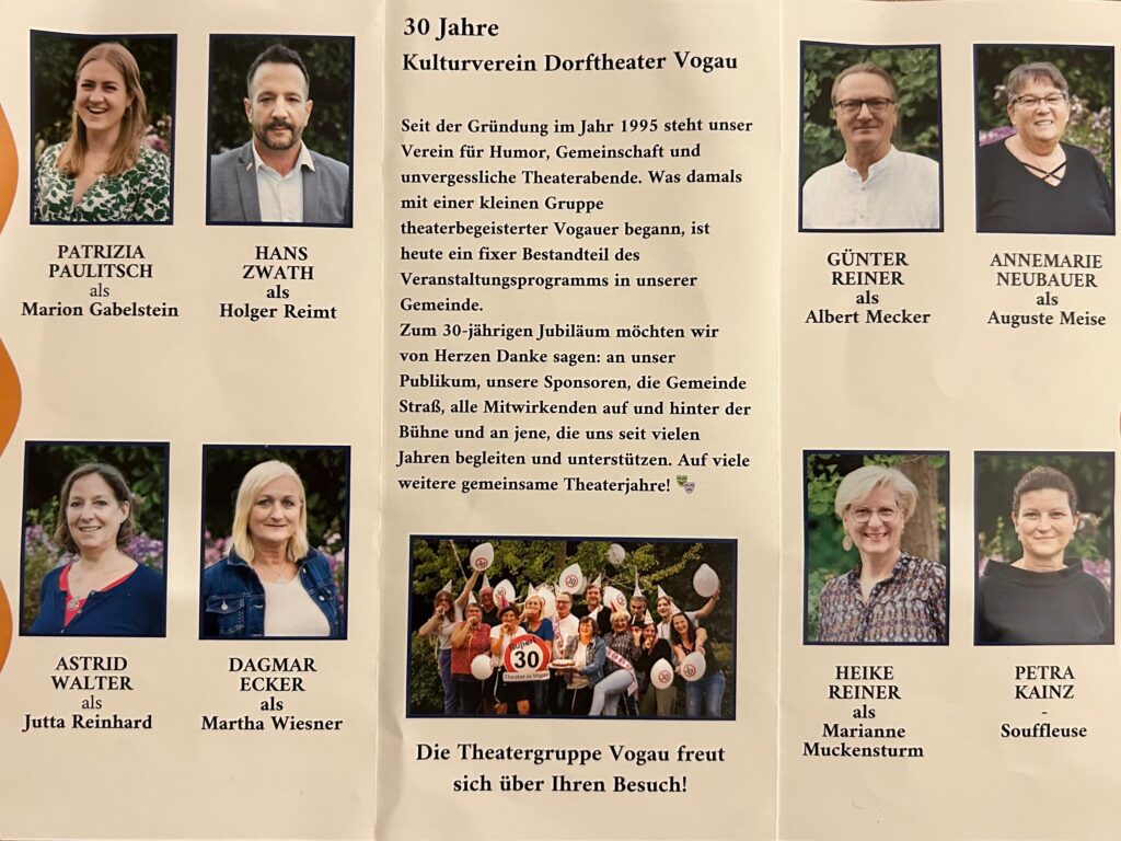 Wenn eines unserer Lieblings-Kollegen-Amateurtheater spielt, sind wir gerne dabei! Der Kulturverein Dorftheater Vogau existiert nunmehr schon seit 30 Jahren, im Jubiläumsjahr wird das Stück "Darum prüfe, wie man sich ewig windet" aufgeführt. Ob- (und "Putzfrau") Dagmar Ecker betonte in ihrer launigen Einführung, dass mit Heike und Günter Reiner nicht nur zwei Gründungsmitglieder auf der Bühne stehen, sondern gleich auch ihr Nachwuchs, Viola und Elias Reiner, in den Hauptrollen.