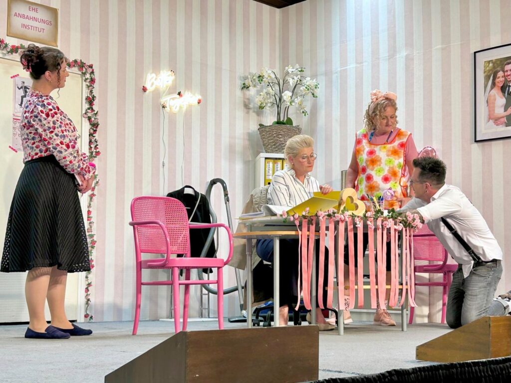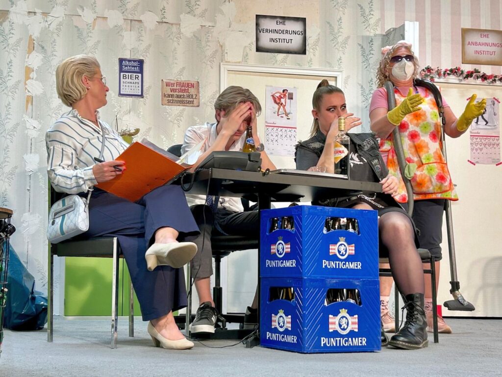 Mit dem Vorhang eröffnet sich ein stimmiges, bis ins Detail liebevoll gestaltetes Bühnenbild, welches die Grundidee des Stücks idealtypisch darstellt: Links ein etwas verlottertes "Bleibe alleine - aber glücklich!" Büro, rechts eine zuckerlrosa blumige "Gib der Braut eine Chance!" Heiratsvermittlung. In dieser Szenerie wird das Spannungsfeld zwischen Heiraten wollen oder nicht buchstäblich lustvoll zelebriert, mit geschickt verwobenen parallelen Handlungssträngen. Dabei dominieren auf den ersten Blick die typischen Geschlechter-Stereotype, welche auch nicht vor Anspielungen unter der Gürtellinie zurückschrecken. Diese werden aber immer wieder relativiert, vor allem durch die originelle Auflösung am Schluss. Eine wesentliche Rolle spielt auch das Bier, soweit noch passend, und doch ein Kritikpunkt: Konsumiert wird die bekannte blaue Marke eines internationalen Konzerns, ein seelenloses Industrieprodukt, statt dass auf heimische Privatbrauereien zurückgegriffen wurde - eine verpasste Chance! Trotzdem ein unterhaltsamer Abend, insbesondere durch die begeisternde Darbietung des witzigen Ensembles!