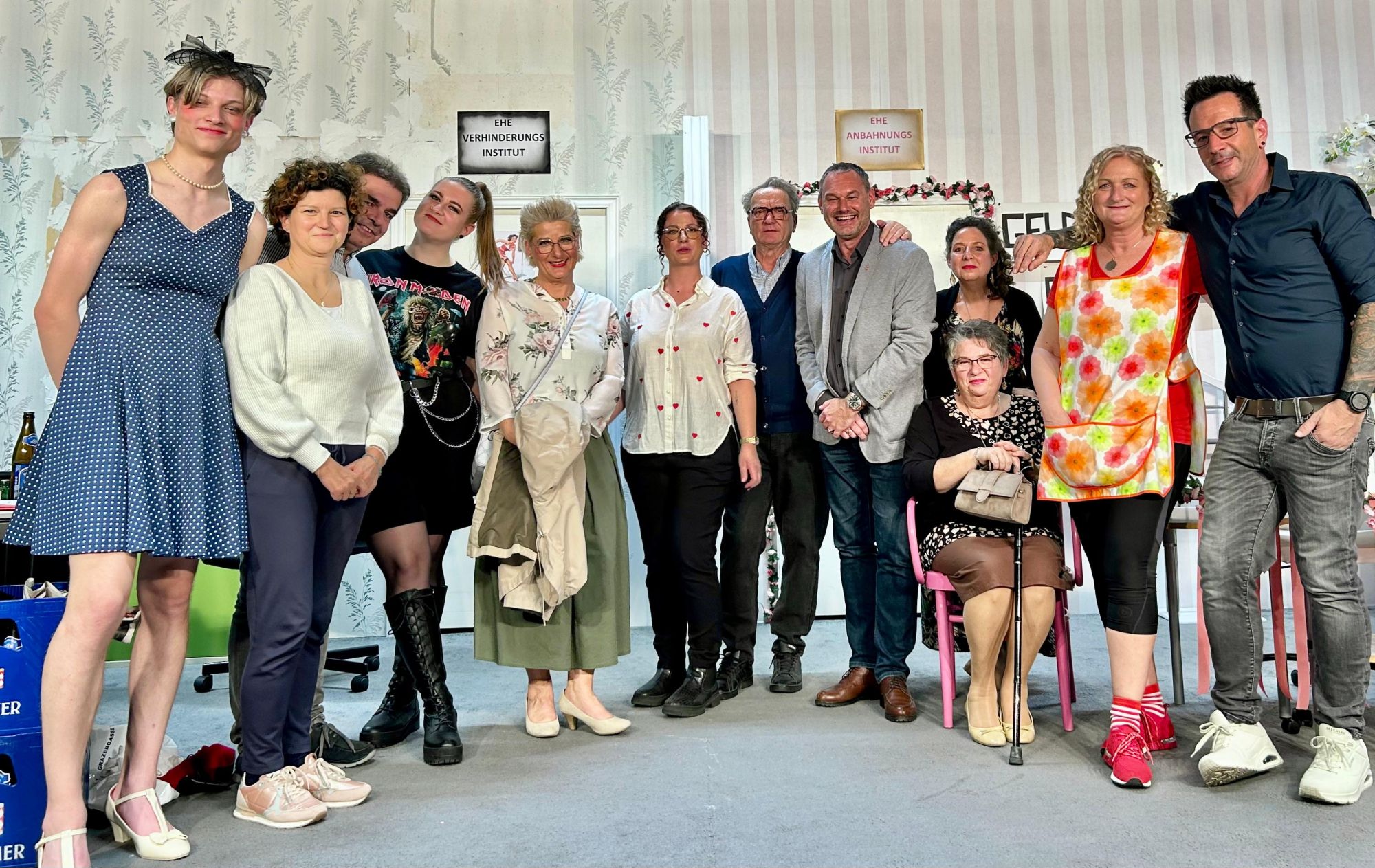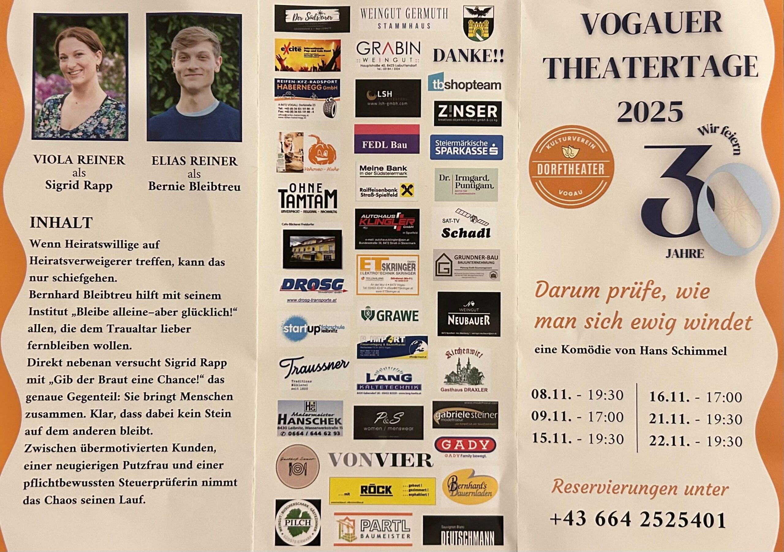 Wenn eines unserer Lieblings-Kollegen-Amateurtheater spielt, sind wir gerne dabei! Der Kulturverein Dorftheater Vogau existiert nunmehr schon seit 30 Jahren, im Jubiläumsjahr wird das Stück "Darum prüfe, wie man sich ewig windet" aufgeführt. Ob- (und "Putzfrau") Dagmar Ecker betonte in ihrer launigen Einführung, dass mit Heike und Günter Reiner nicht nur zwei Gründungsmitglieder auf der Bühne stehen, sondern gleich auch ihr Nachwuchs, Viola und Elias Reiner, in den Hauptrollen.